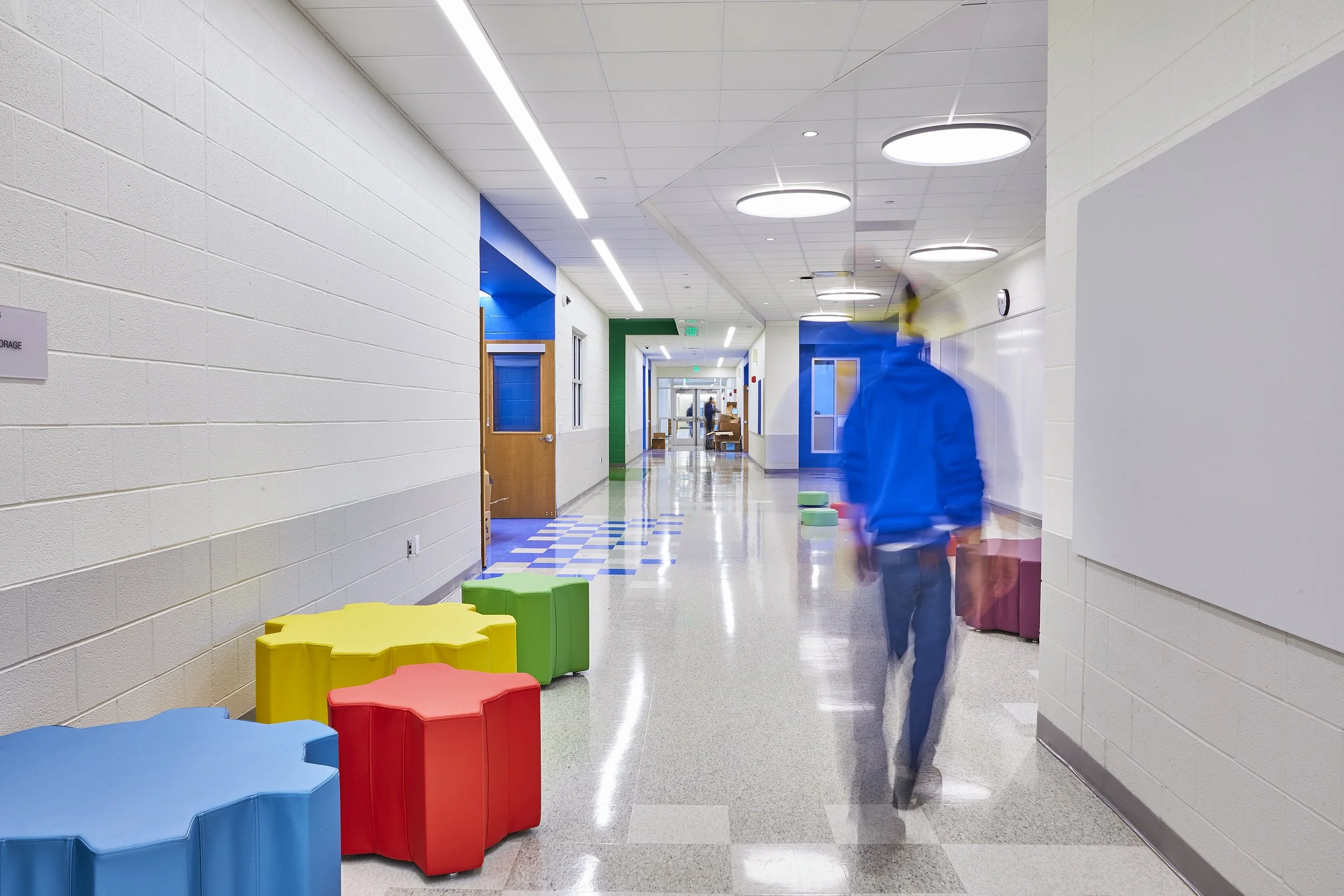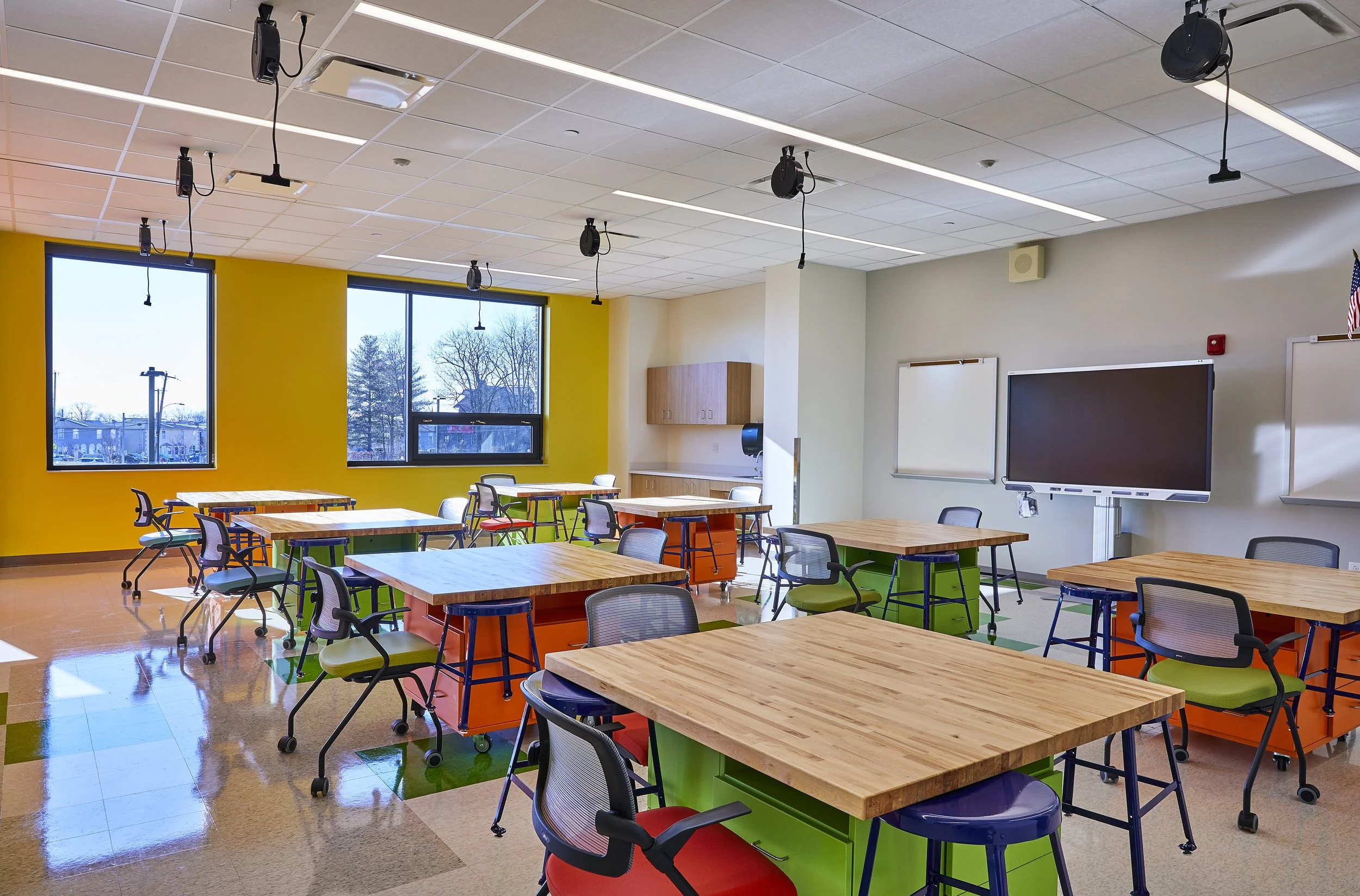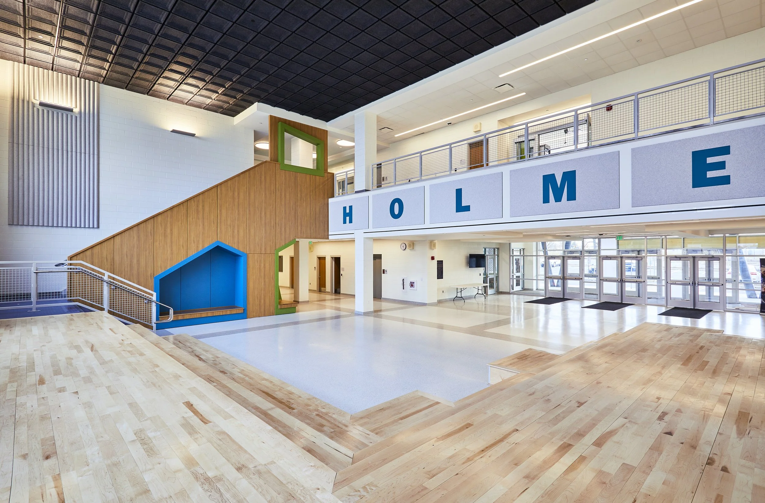 The Thomas Holme Elementary School was a Design/Build Project to replace the existing school facility with a larger capacity, modern, 21st Century Learning Center with a sustainable goal of a LEED Gold Certification. The 141,000sf three story building includes conventional classrooms, dining hall, gymnatorium, music & vocal spaces, dance studio, maker space, instruction materials center, discovery commons, and administrative space. This building serves pre-kindergarten through eighth grades. When accessing the main entrance, a two story Welcome Center is the main hub of the school with tiered platform seating and a stairway connecting this unique common space to the second floor.